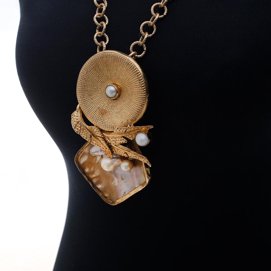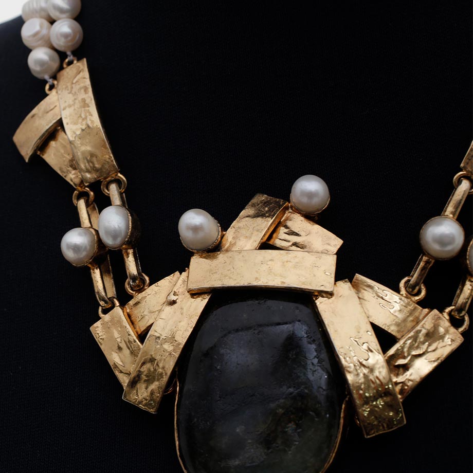 For Manila FAME this year, Evaristo’s collection is all handmade, features hammered brass, electroplated in 18K gold. His lineup includes chokers with freshwater pearls, as well as necklaces and statement earrings in select materials, like coral, jade and pearls. A brass evening clutch that features canvass painting can also be had.