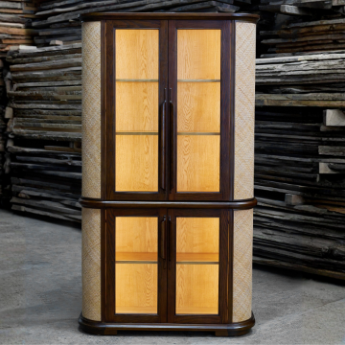 Ash wood in Espresso and Natural finish with rattan matting, LED strips, and Salice hinges — inquire now.