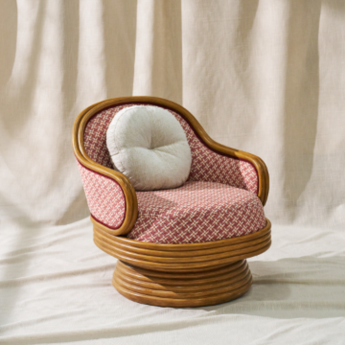 Rattan in Natural finish with Prestigious Tiles Riva 4040 Cinnabar 331 fabric, detailed with Honcho 38-Vino piping and pillow — inquire now.