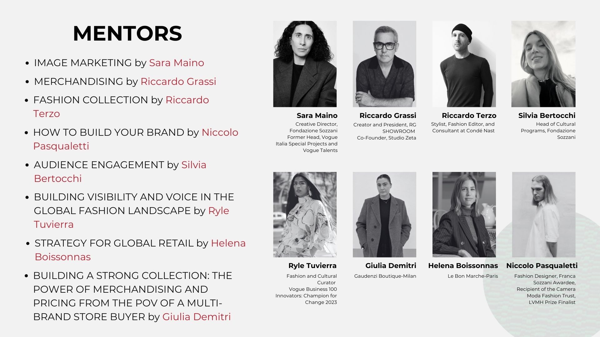 Headed by Maino, each of the Milan cohort of mentors shared with the designers their expertise in specific areas of the fashion design industry.