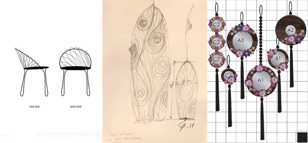 Design Commune’s “Elements of Nature” has been liberally inspired by the forms, colors, and textures found in the natural physical world, as demonstrated in the sketches and prototypes for some of the home and holiday decor that would be on exhibit at Manila FAME 2025. (Left to right) A. Garcia's chair prototype, a TADECO Home sketch, and various models for Kathryn Fanlo floral wall mirrors.